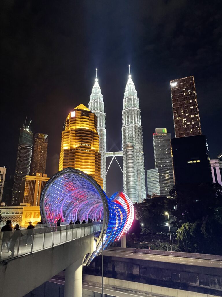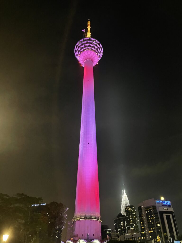 KLCCにはもう一つ大きなタワー、KLタワーがあります。こちらは外から見てももちろん綺麗ですが、KLタワーに登ってツインタワーを見るのがおすすめです。Klookで大人2500円ほどで展望台チケット売っているので、お金払ってでも登る価値あります。