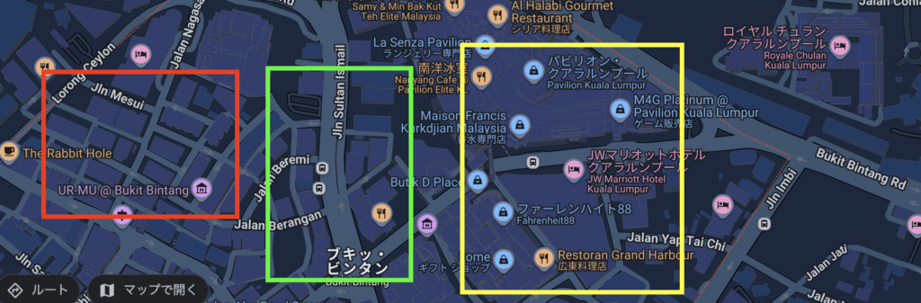 黄色:マレーシアの六本木といわれる華やかなエリア、高級ショッピングモールやJWマリオットなど、5つ星ホテルが多数ある