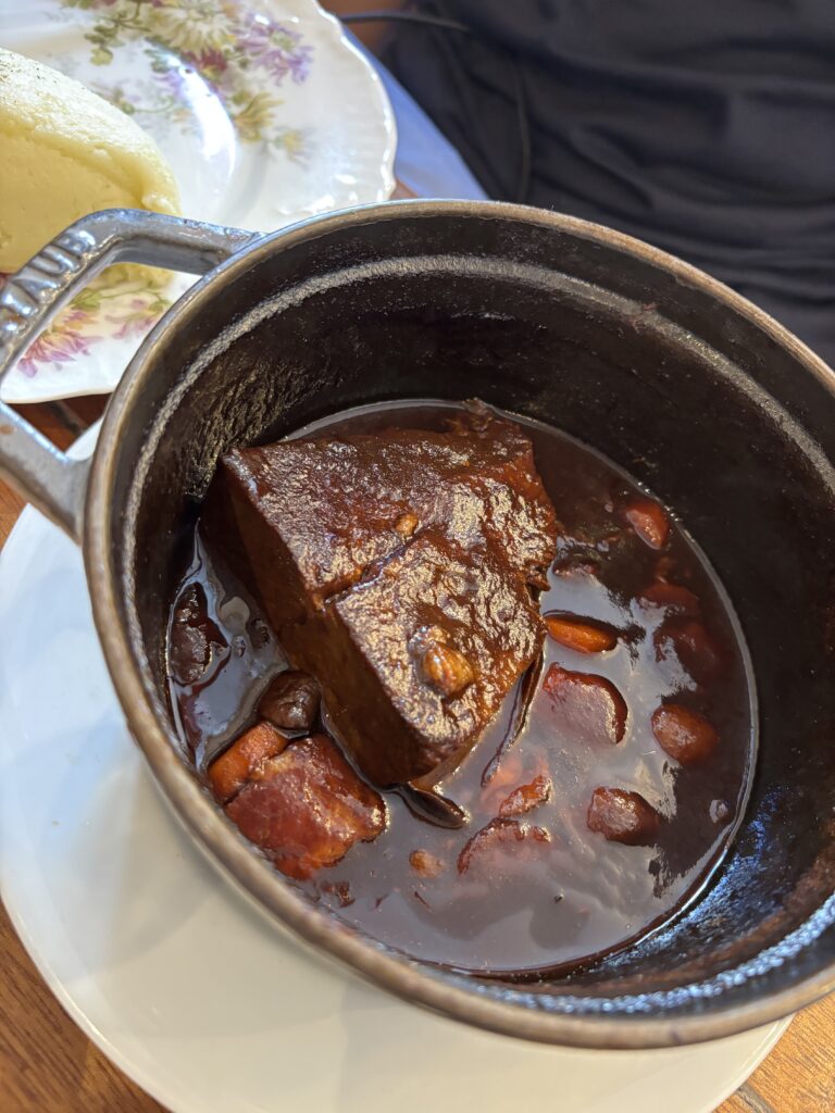 サントシャペル見学後は昼食休憩にしました。Le Café des Musées というレストランでビーフブルギニョンという牛肉をワインで煮込んだ料理とサーモンのタタキをいただきました。ビーフブルギニョンはお肉がほろほろでワインの酸味が効いてて美味しかったです。サーモンは絶妙な調理加減で付け合わせのお野菜が美味しかったです。ここではワインは飲まず合計50ユーロくらいでした。
