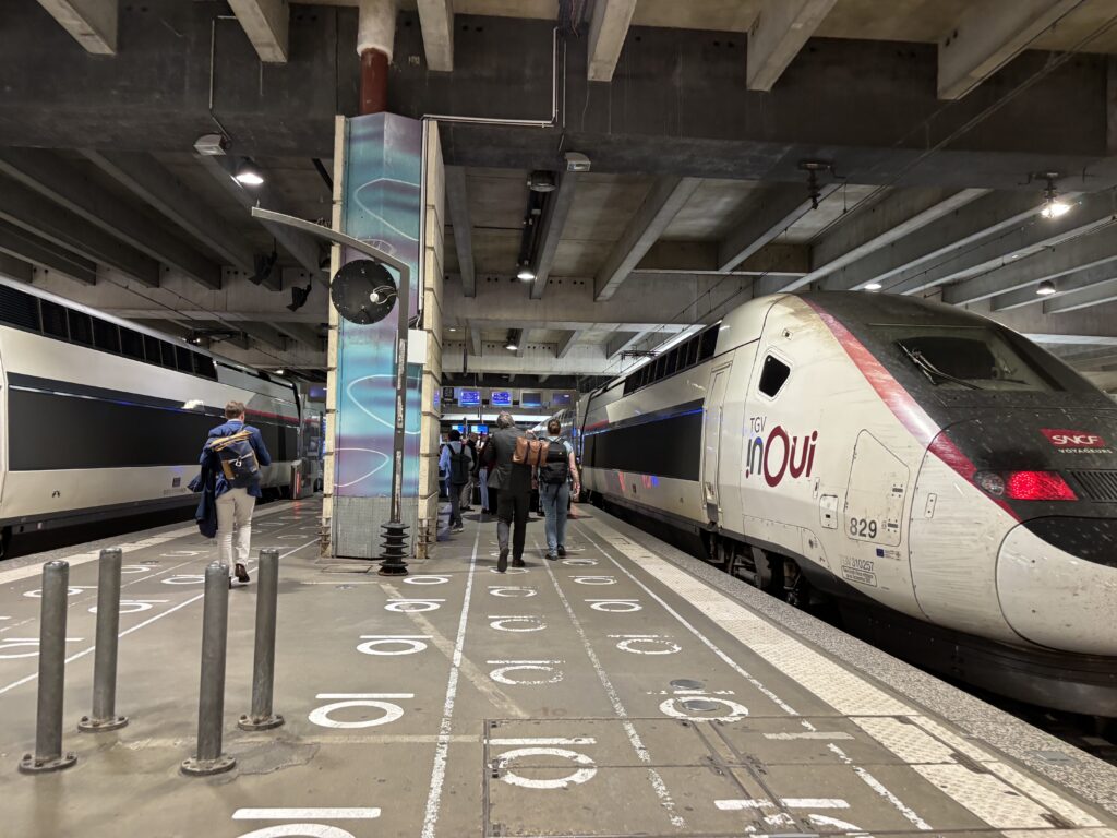 パリからはモンパルナス駅という大きな駅から出発します。モンパルナスはメトロも通っているのですが、メトロからTGVが発着しているプラットフォームまでは徒歩で10分ほどかかるので余裕を持って移動した方が良いです。そして例に漏れず、出発時間の30分にプラットフォームがわかるのでそれまで待ちます。