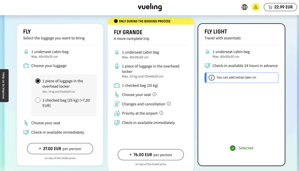 出発地、目的地、日付などを入力して検索すると下のような画面が出てきます。ブエリング航空はチケットのタイプが3種類あり、チケットによって値段や座席予約の有無があります。1時間ちょいのフライトだったため、座席は特に気にしなかったのですが、スーツケースがあったため追加でお金を支払う必要がありました。