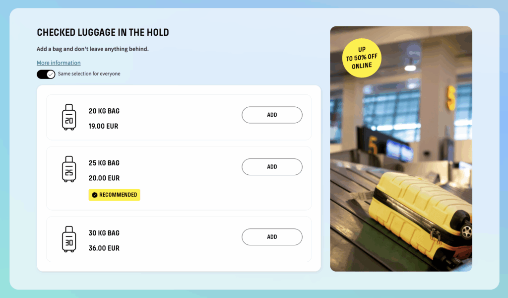 スーツケースがあるならFLYというタイプを買ったほうがいいのか?と思いましたが、とりあえずFLY LIGHTで進めると、後ほど荷物を追加する選択が出てきました。(下の図)座席の指定はぜず、より安く予約したかったので、FLY LIGHT+25KGの荷物追加で購入しました。